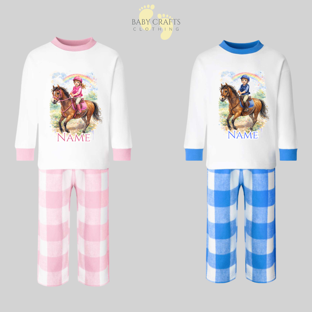 Personalised Children's Horse Check Pyjamas. Available in Pink Or Blue.